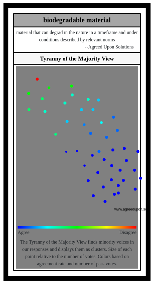 The Tyranny of the Majority View finds minority voices in our responses and displays them as clusters. Size of each point relative to the number of votes. Colors based on agreement rate and number of pass votes.