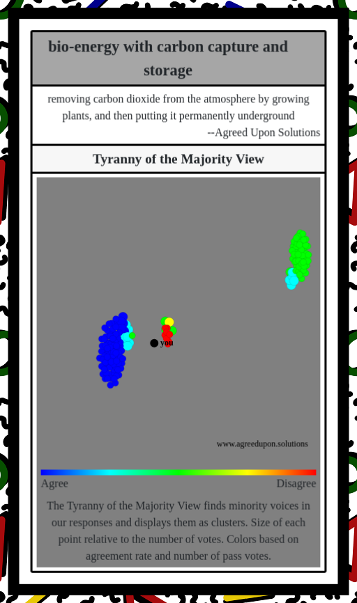 The Tyranny of the Majority View finds minority voices in our responses and displays them as clusters. Size of each point relative to the number of votes. Colors based on agreement rate and number of pass votes.