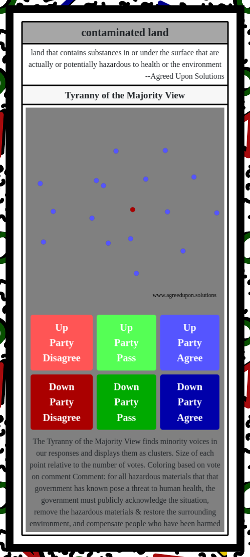 The Tyranny of the Majority View finds minority voices in our responses and displays them as clusters. Size of each point relative to the number of votes. Coloring based on vote on comment