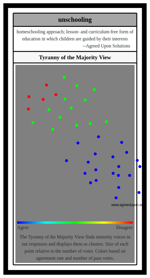 The Tyranny of the Majority View finds minority voices in our responses and displays them as clusters. Size of each point relative to the number of votes. Colors based on agreement rate and number of pass votes.