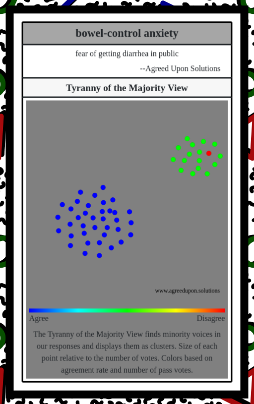 The Tyranny of the Majority View finds minority voices in our responses and displays them as clusters. Size of each point relative to the number of votes. Colors based on agreement rate and number of pass votes.