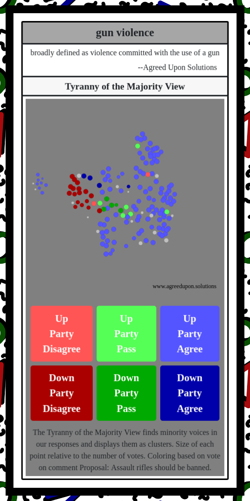The Tyranny of the Majority View finds minority voices in our responses and displays them as clusters. Size of each point relative to the number of votes. Coloring based on vote on comment