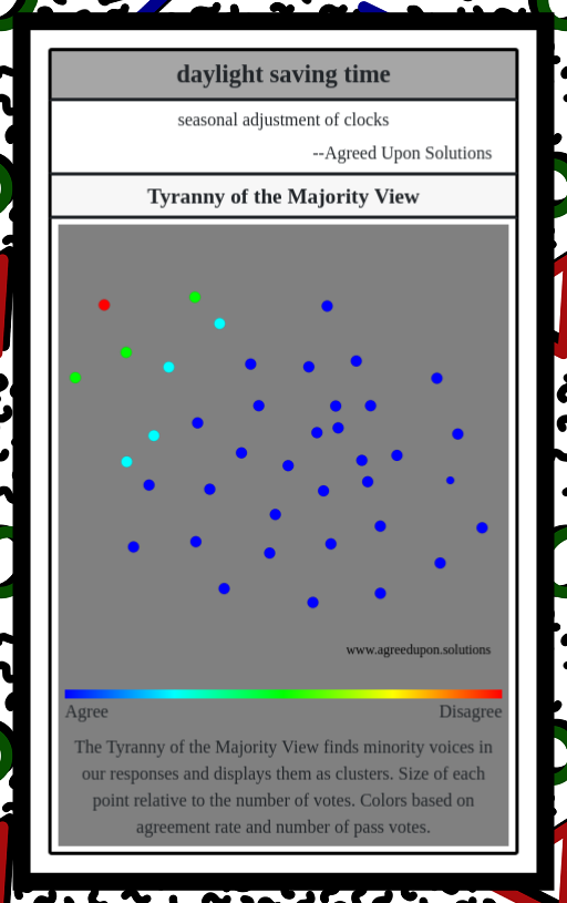 The Tyranny of the Majority View finds minority voices in our responses and displays them as clusters. Size of each point relative to the number of votes. Colors based on agreement rate and number of pass votes.