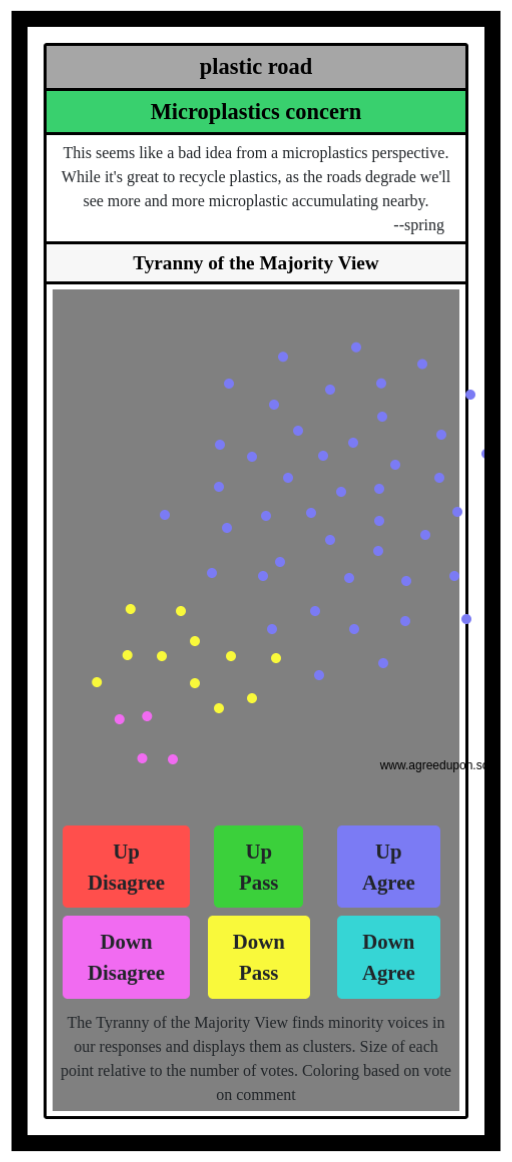The Tyranny of the Majority View finds minority voices in our responses and displays them as clusters. Size of each point relative to the number of votes. Coloring based on vote on comment