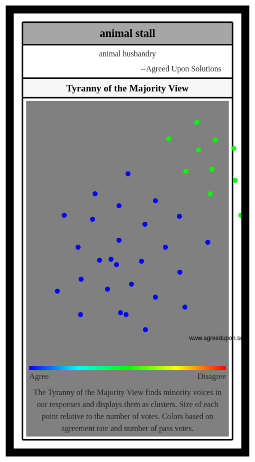 The Tyranny of the Majority View finds minority voices in our responses and displays them as clusters. Size of each point relative to the number of votes. Colors based on agreement rate and number of pass votes.