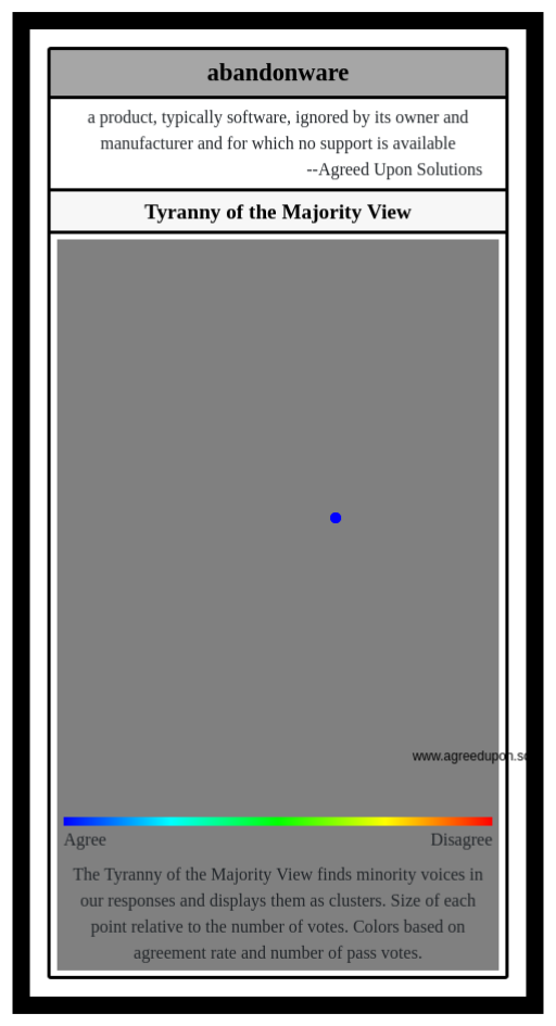 The Tyranny of the Majority View finds minority voices in our responses and displays them as clusters. Size of each point relative to the number of votes. Colors based on agreement rate and number of pass votes.