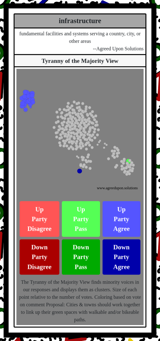 The Tyranny of the Majority View finds minority voices in our responses and displays them as clusters. Size of each point relative to the number of votes. Coloring based on vote on comment