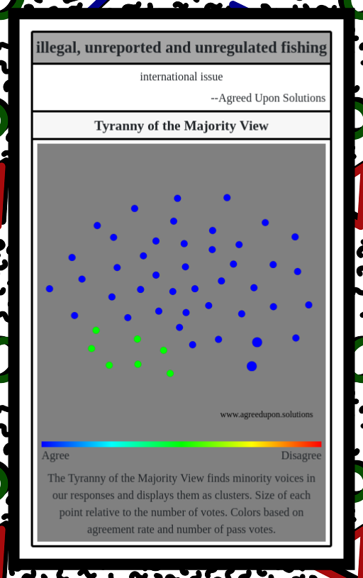 The Tyranny of the Majority View finds minority voices in our responses and displays them as clusters. Size of each point relative to the number of votes. Colors based on agreement rate and number of pass votes.