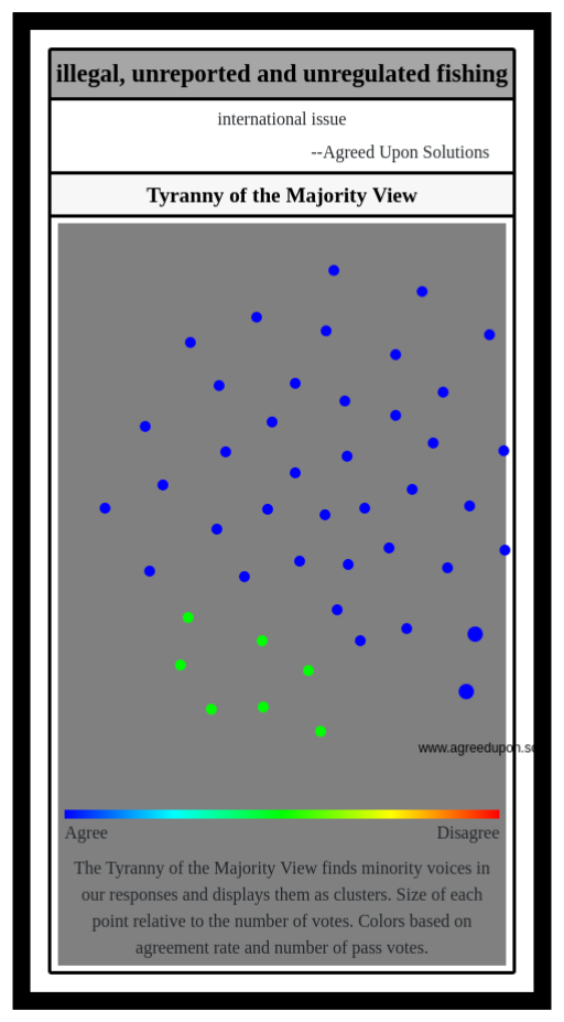 The Tyranny of the Majority View finds minority voices in our responses and displays them as clusters. Size of each point relative to the number of votes. Colors based on agreement rate and number of pass votes.