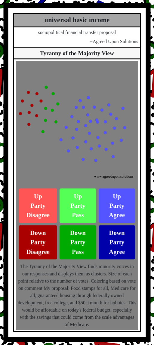 Food stamps for all, Medicare for all, guaranteed housing through federally owned development, free college, and $50 a month for hobbies. This would be affordable on today's federal budget, especially with the savings that could come from the scale advantages of Medicare.