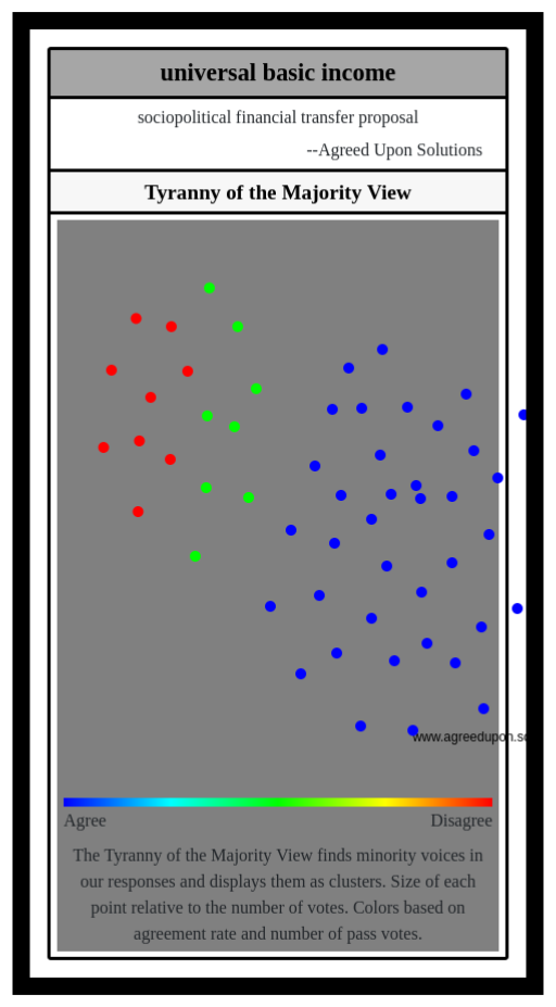 The Tyranny of the Majority View finds minority voices in our responses and displays them as clusters. Size of each point relative to the number of votes. Colors based on agreement rate and number of pass votes.