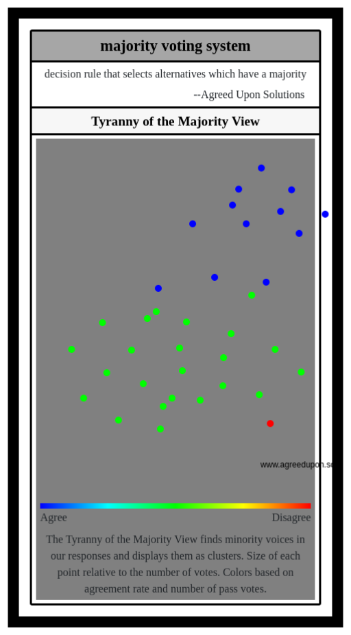 The Tyranny of the Majority View finds minority voices in our responses and displays them as clusters. Size of each point relative to the number of votes. Colors based on agreement rate and number of pass votes.