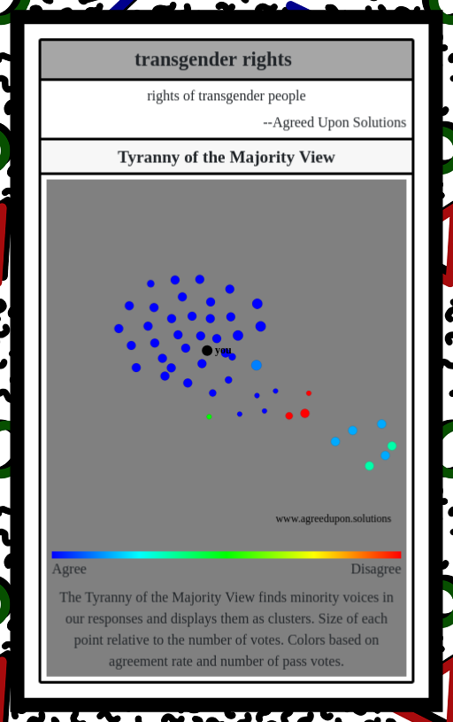 The Tyranny of the Majority View finds minority voices in our responses and displays them as clusters. Size of each point relative to the number of votes. Colors based on agreement rate and number of pass votes.