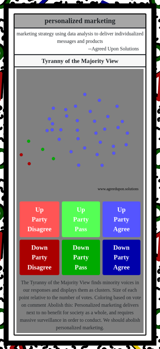The Tyranny of the Majority View finds minority voices in our responses and displays them as clusters. Size of each point relative to the number of votes. Coloring based on vote on comment