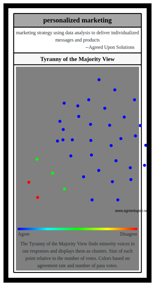 The Tyranny of the Majority View finds minority voices in our responses and displays them as clusters. Size of each point relative to the number of votes. Colors based on agreement rate and number of pass votes.