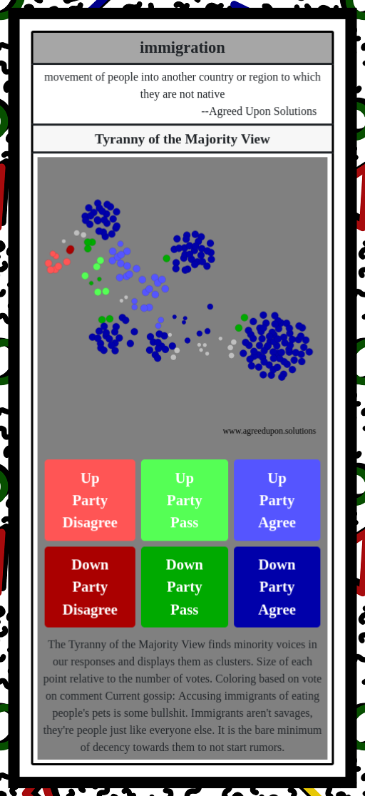 The Tyranny of the Majority View finds minority voices in our responses and displays them as clusters. Size of each point relative to the number of votes. Coloring based on vote on comment