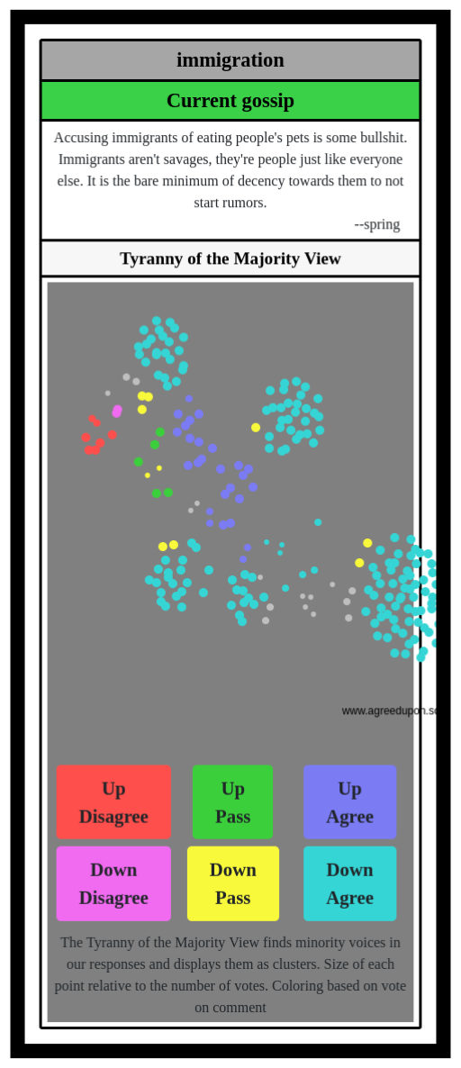 The Tyranny of the Majority View finds minority voices in our responses and displays them as clusters. Size of each point relative to the number of votes. Coloring based on vote on comment