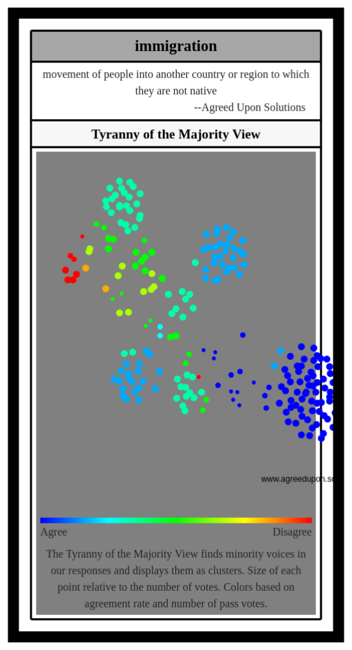 The Tyranny of the Majority View finds minority voices in our responses and displays them as clusters. Size of each point relative to the number of votes. Colors based on agreement rate and number of pass votes.