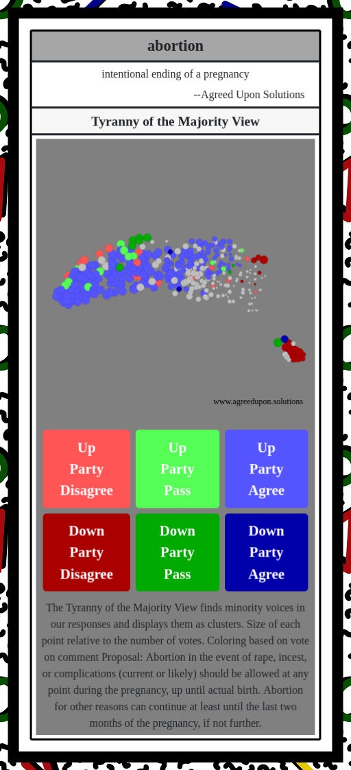 The Tyranny of the Majority View finds minority voices in our responses and displays them as clusters. Size of each point relative to the number of votes. Coloring based on vote on comment