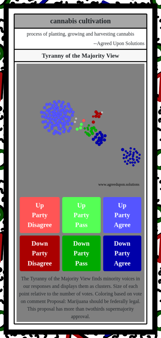 The Tyranny of the Majority View finds minority voices in our responses and displays them as clusters. Size of each point relative to the number of votes. Coloring based on vote on comment