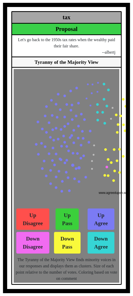 The Tyranny of the Majority View finds minority voices in our responses and displays them as clusters. Size of each point relative to the number of votes. Coloring based on vote on comment