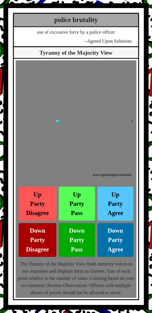 The Tyranny of the Majority View finds minority voices in our responses and displays them as clusters. Size of each point relative to the number of votes. Coloring based on vote on comment