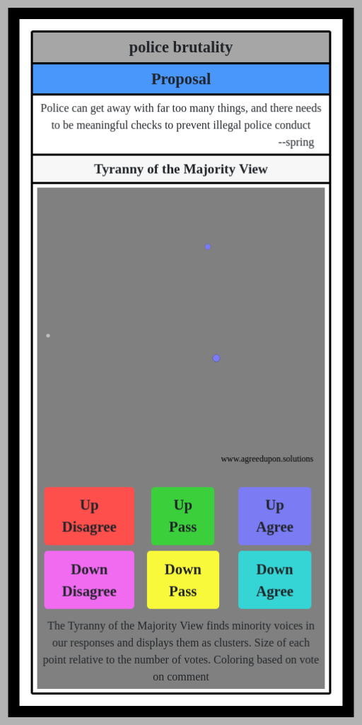 The Tyranny of the Majority View finds minority voices in our responses and displays them as clusters. Size of each point relative to the number of votes. Coloring based on vote on comment