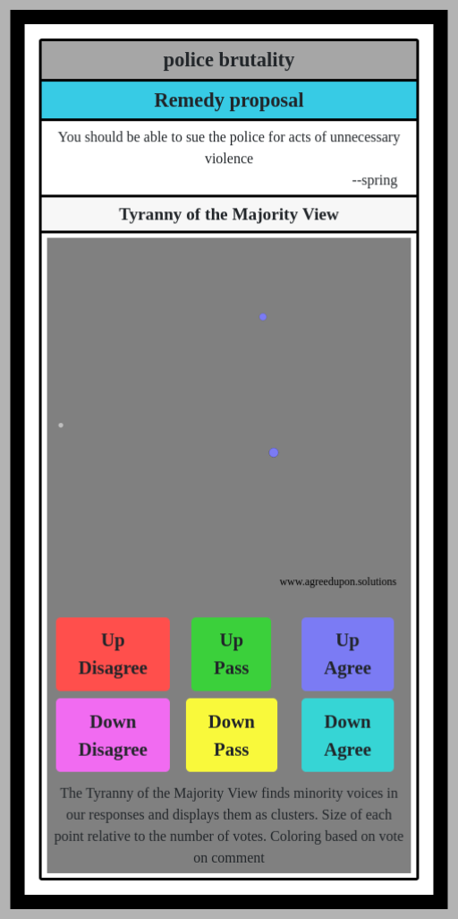 The Tyranny of the Majority View finds minority voices in our responses and displays them as clusters. Size of each point relative to the number of votes. Coloring based on vote on comment