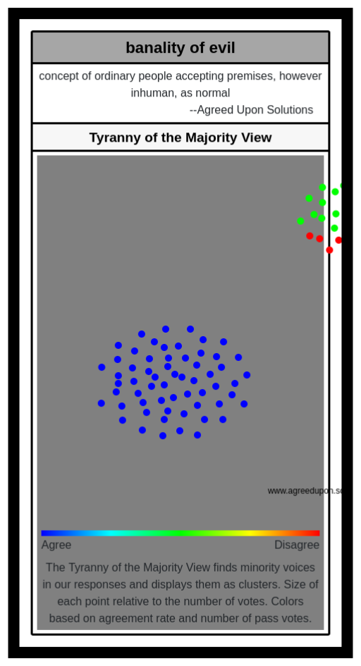 The Tyranny of the Majority View finds minority voices in our responses and displays them as clusters. Size of each point relative to the number of votes. Colors based on agreement rate and number of pass votes.