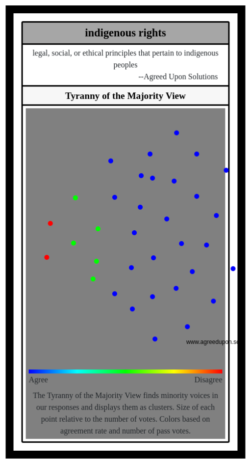 The Tyranny of the Majority View finds minority voices in our responses and displays them as clusters. Size of each point relative to the number of votes. Colors based on agreement rate and number of pass votes.