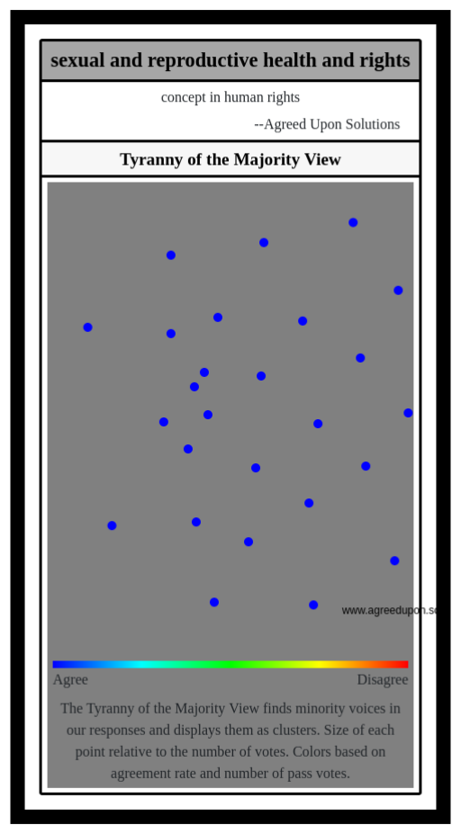 The Tyranny of the Majority View finds minority voices in our responses and displays them as clusters. Size of each point relative to the number of votes. Colors based on agreement rate and number of pass votes.