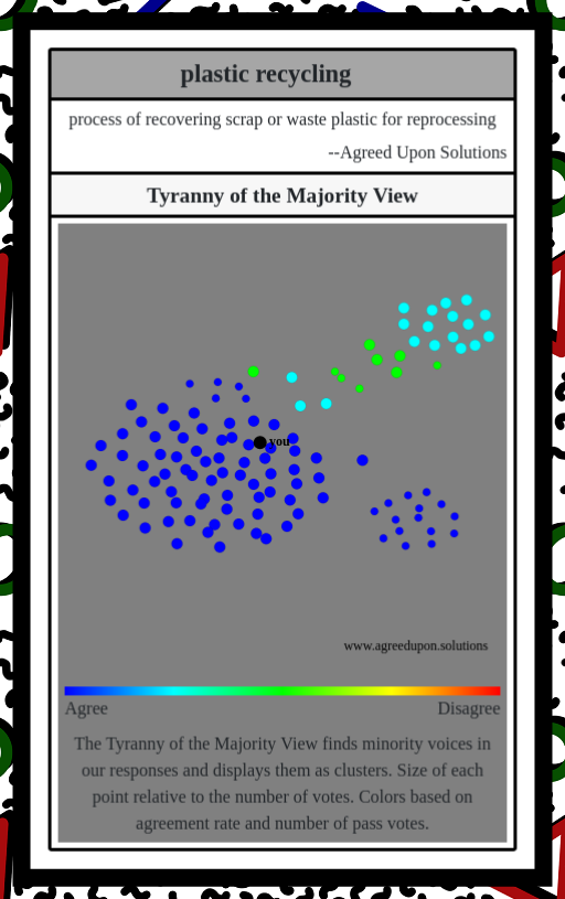 The Tyranny of the Majority View finds minority voices in our responses and displays them as clusters. Size of each point relative to the number of votes. Colors based on agreement rate and number of pass votes.
