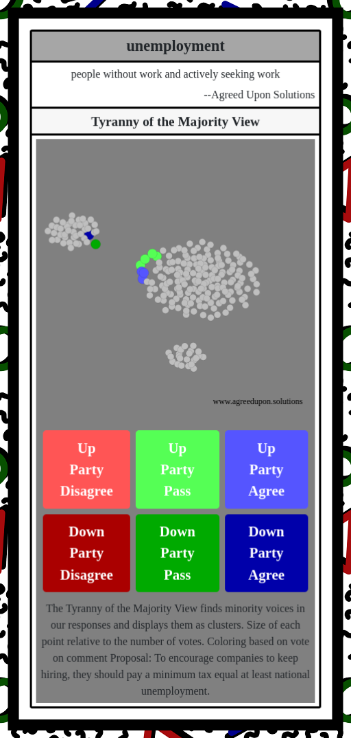 The Tyranny of the Majority View finds minority voices in our responses and displays them as clusters. Size of each point relative to the number of votes. Coloring based on vote on comment