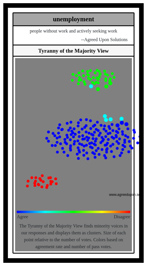 The Tyranny of the Majority View finds minority voices in our responses and displays them as clusters. Size of each point relative to the number of votes. Colors based on agreement rate and number of pass votes.