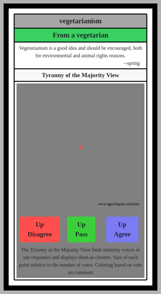 The Tyranny of the Majority View finds minority voices in our responses and displays them as clusters. Size of each point relative to the number of votes. Coloring based on vote on comment