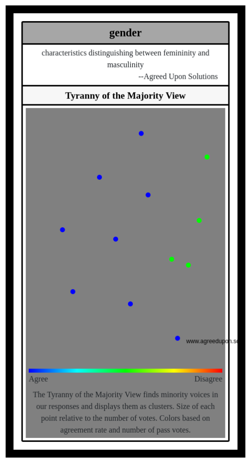 The Tyranny of the Majority View finds minority voices in our responses and displays them as clusters. Size of each point relative to the number of votes. Colors based on agreement rate and number of pass votes.