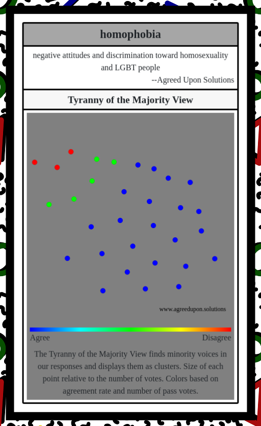 The Tyranny of the Majority View finds minority voices in our responses and displays them as clusters. Size of each point relative to the number of votes. Colors based on agreement rate and number of pass votes.