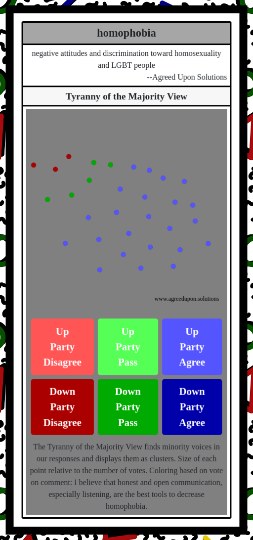 The Tyranny of the Majority View finds minority voices in our responses and displays them as clusters. Size of each point relative to the number of votes. Coloring based on vote on comment