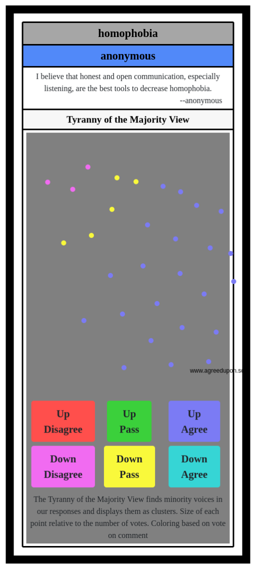 The Tyranny of the Majority View finds minority voices in our responses and displays them as clusters. Size of each point relative to the number of votes. Coloring based on vote on comment