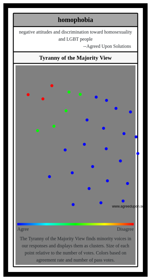The Tyranny of the Majority View finds minority voices in our responses and displays them as clusters. Size of each point relative to the number of votes. Colors based on agreement rate and number of pass votes.