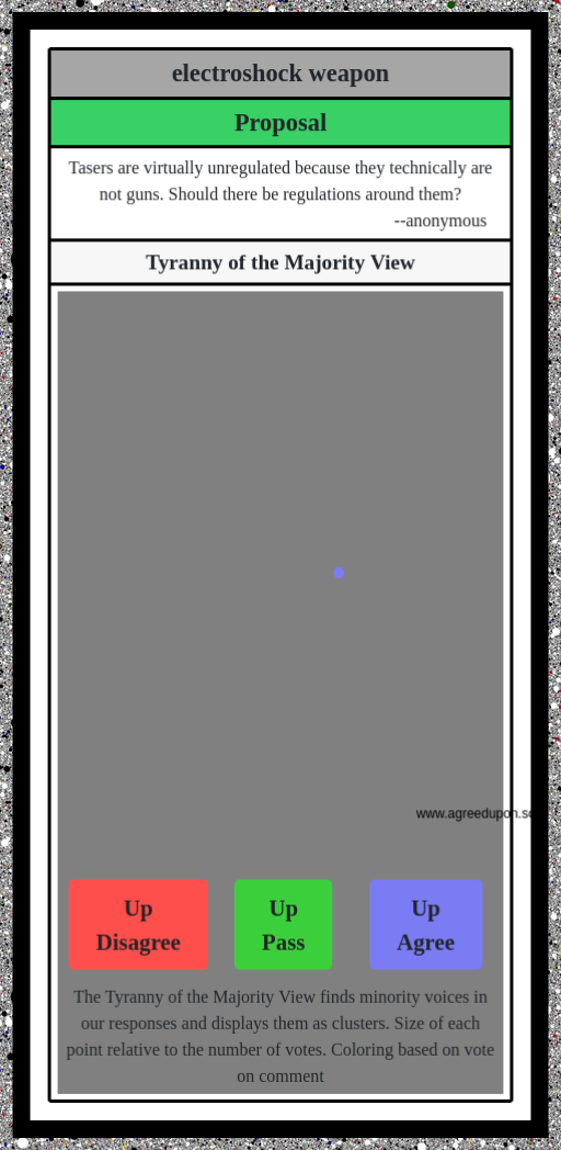 The Tyranny of the Majority View finds minority voices in our responses and displays them as clusters. Size of each point relative to the number of votes. Coloring based on vote on comment