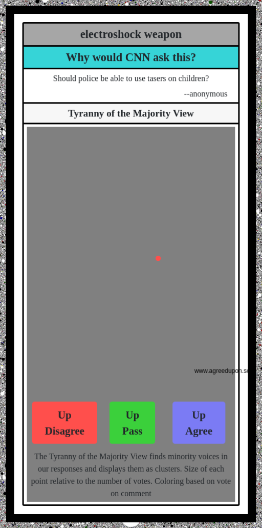 The Tyranny of the Majority View finds minority voices in our responses and displays them as clusters. Size of each point relative to the number of votes. Coloring based on vote on comment