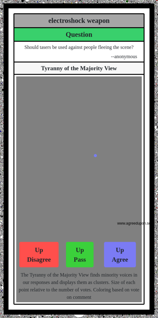 The Tyranny of the Majority View finds minority voices in our responses and displays them as clusters. Size of each point relative to the number of votes. Coloring based on vote on comment