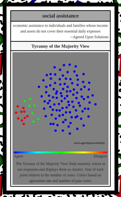 The Tyranny of the Majority View finds minority voices in our responses and displays them as clusters. Size of each point relative to the number of votes. Colors based on agreement rate and number of pass votes.