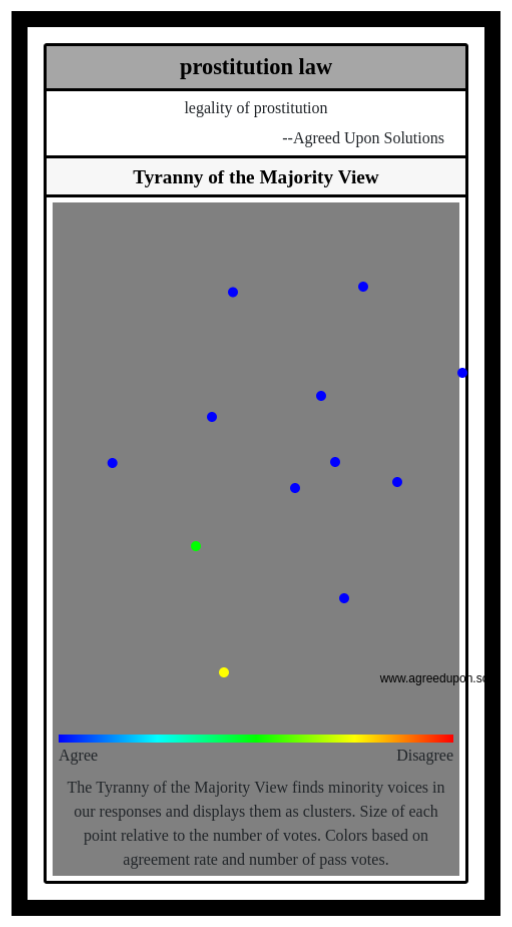 The Tyranny of the Majority View finds minority voices in our responses and displays them as clusters. Size of each point relative to the number of votes. Colors based on agreement rate and number of pass votes.