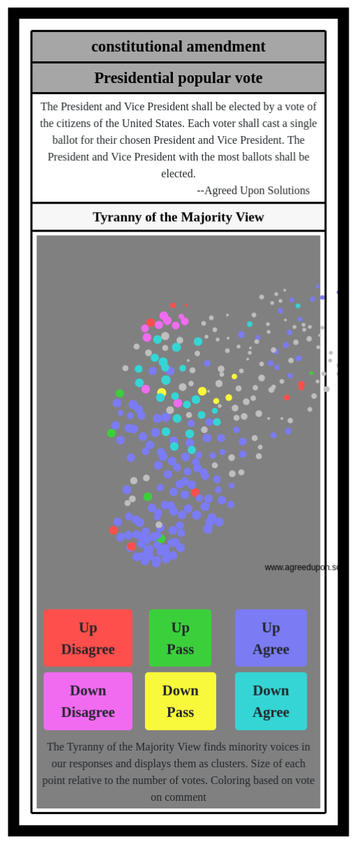 The Tyranny of the Majority View finds minority voices in our responses and displays them as clusters. Size of each point relative to the number of votes. Coloring based on vote on comment