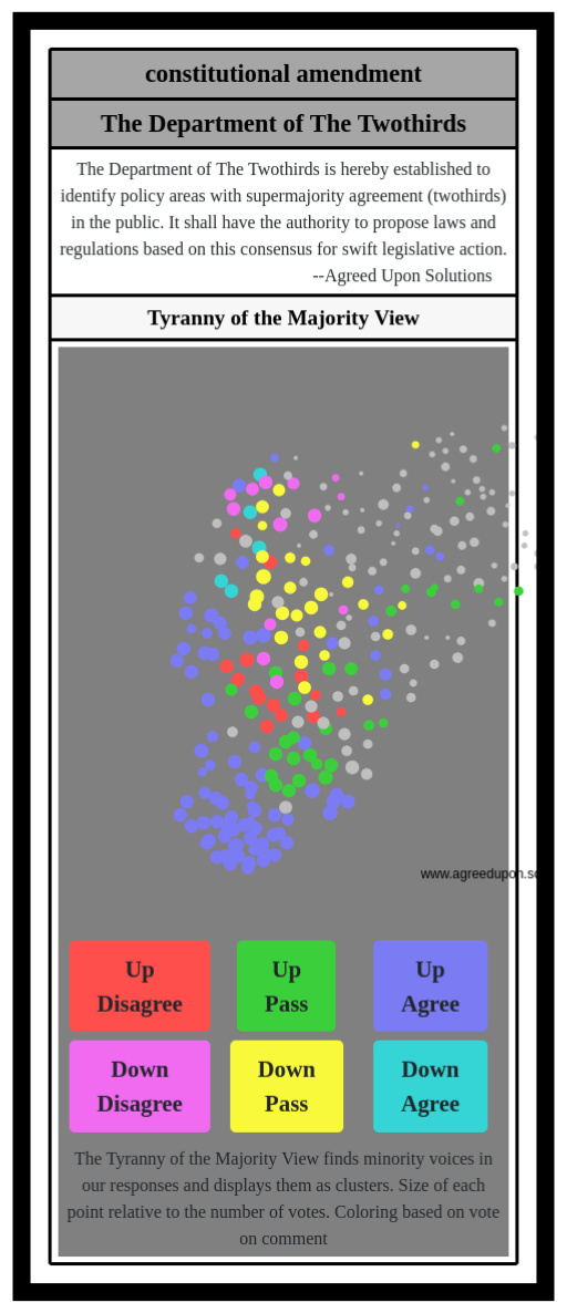 The Department of The Twothirds is hereby established to identify policy areas with supermajority agreement (twothirds) in the public. It shall have the authority to propose laws and regulations based on this consensus for swift legislative action.