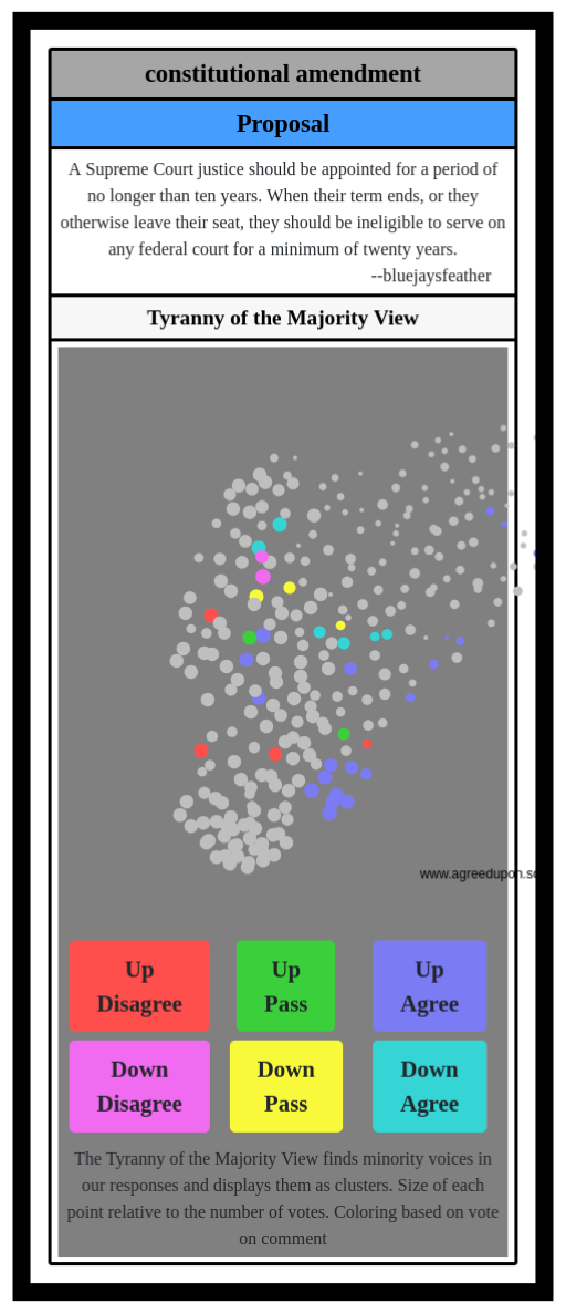 The Tyranny of the Majority View finds minority voices in our responses and displays them as clusters. Size of each point relative to the number of votes. Coloring based on vote on comment