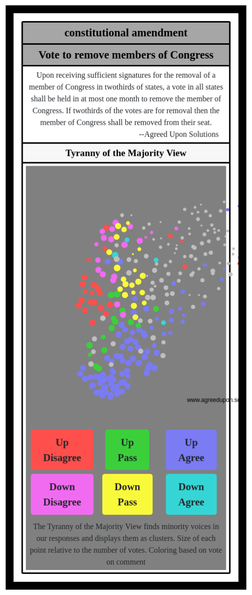 Upon receiving sufficient signatures for the removal of a member of Congress in twothirds of states, a vote in all states shall be held in at most one month to remove the member of Congress. If twothirds of the votes are for removal then the member of Congress shall be removed from their seat.