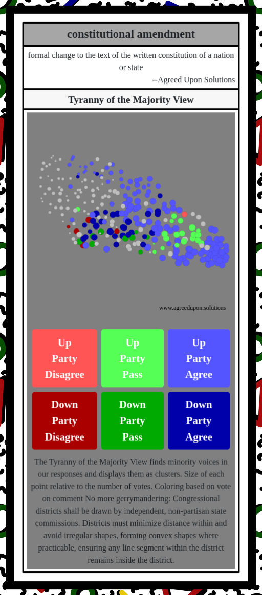 The Tyranny of the Majority View finds minority voices in our responses and displays them as clusters. Size of each point relative to the number of votes. Coloring based on vote on comment